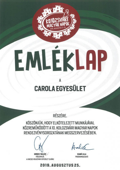Emléklappal jutalmazták a Carola Egyesületet, amiért elkötelezett munkájukkal közreműködtek a 10. jubileumi Kolozsvári Magyar Napok rendezvénysorozatának megszervezésében.